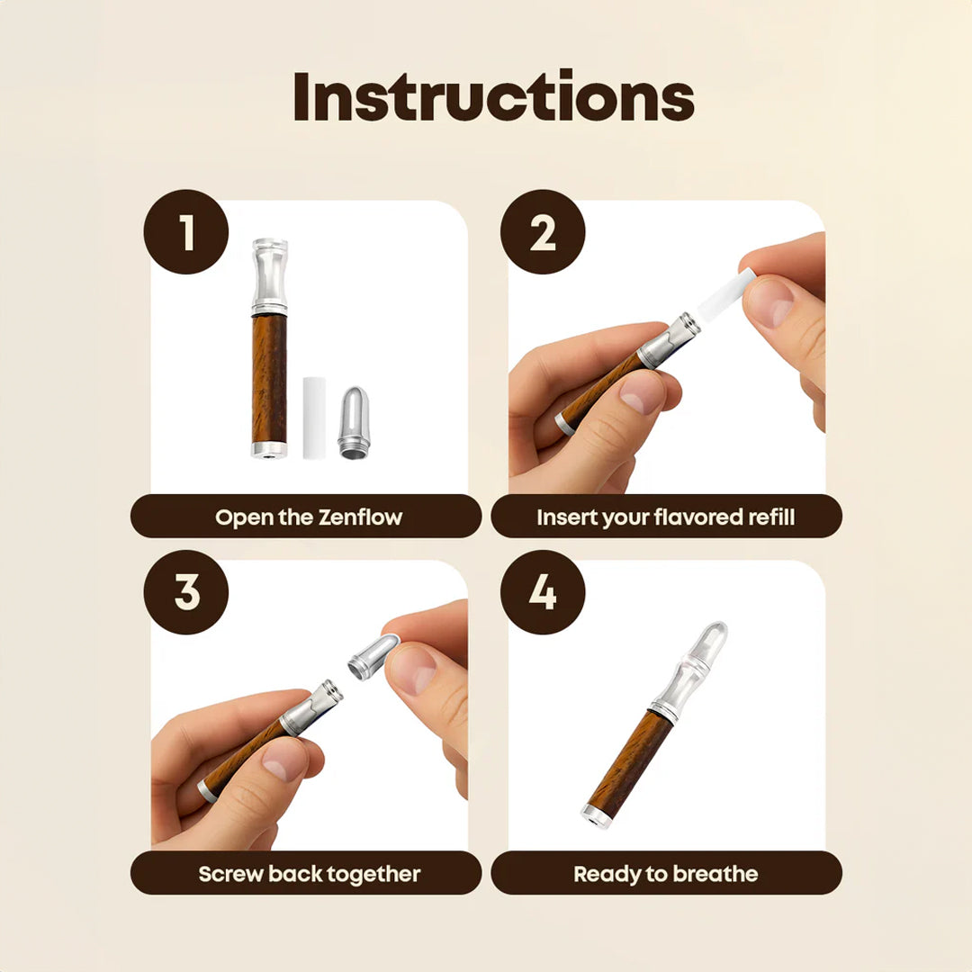 Yes. It’s 100% nicotine-free, vapor-free, and chemical-free - made with natural flavor compounds, not oils. There’s no smoke or heating involved, so you can use it anywhere: on flights, in restaurants, or at work. Using it is simple - just unscrew the zenflow, place a flavor refill inside, and take slow, mindful breaths. Each package includes clear step-by-step instructions so you can start right away.