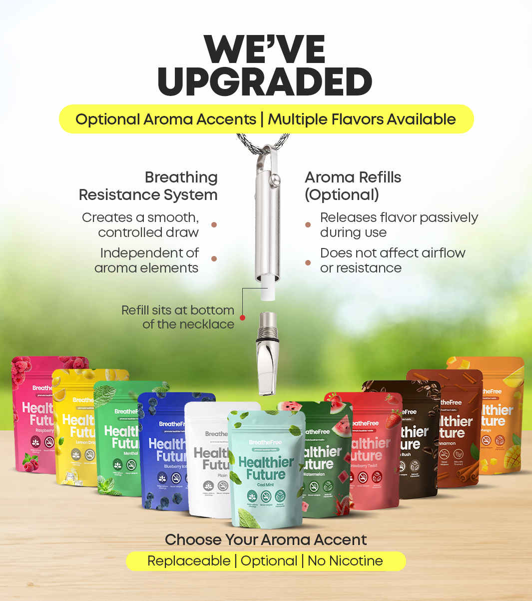 Place an Aroma Accent Refill into the necklace before use - flavor is optional and does not affect airflow. The aroma accent creates a pleasant sensory moment whilst you breathe.